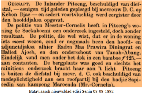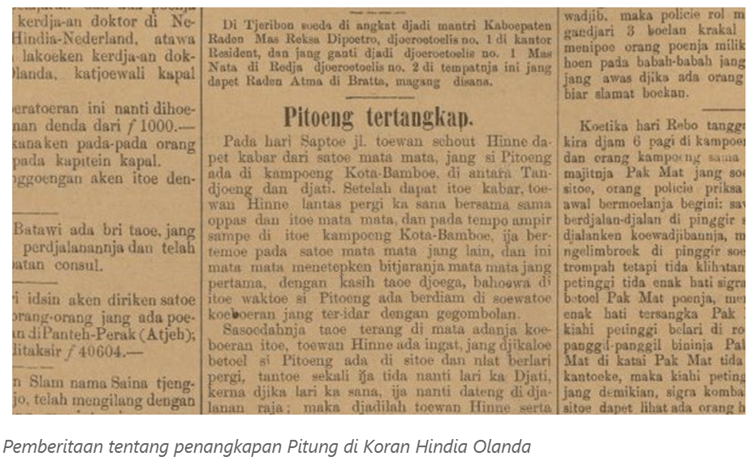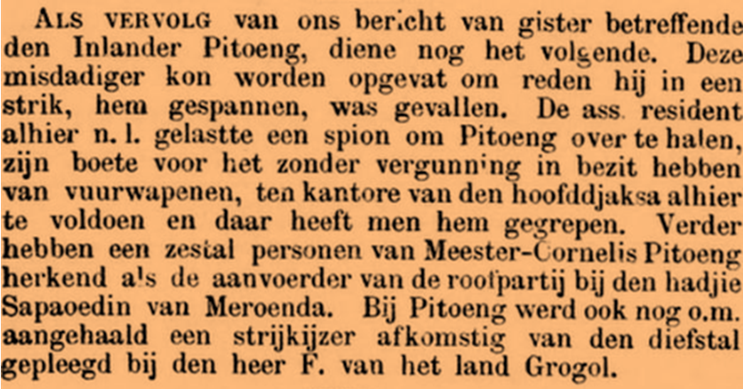 “Sebagai tindak lanjut dari laporan kami kemarin mengenai penduduk asli Pitoeng, saya menambahkan hal berikut. Penjahat ini dapat ditangkap karena ia telah jatuh ke dalam perangkap yang dipasang untuknya. Asisten Residen di sini, No. 1, memerintahkan seorang mata-mata untuk membujuk Pitoeng agar membayar denda atas kepemilikan senjata api tanpa izin di kantor Kepala Jaksa di sini, dan ia ditangkap di sana. Lebih lanjut, enam orang mengidentifikasi Master Cornelis Pitoeng sebagai pemimpin perampokan di Hajie Sapaoedin Meroenda. Di antara barang-barang milik Pitoeng, sebuah setrika yang berasal dari pencurian yang dilakukan di rumah Mr. F. di wilayah Grogol juga disebutkan.”